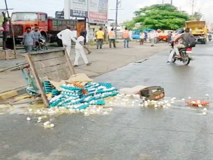 निगम की टीम ने अंड़े का ठेला पटला दिया, जिससे अंडे फूल कर सड़क पर फैल गए।