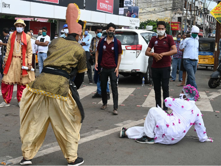 जबलपुर में कोरोना को लेकर रोको-टोको अभियान चल रहा है। आम लोगों को जागरूक करने के लिए नुक्कड़ नाटक करते कलाकार।