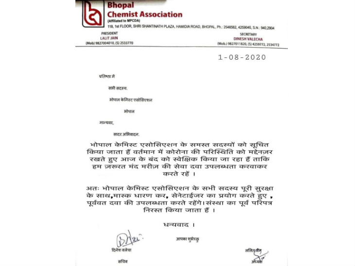लोगों की परेशानी को देखते हुए भोपाल केमिस्ट एसोसिएशन ने बंद वापस ले लिया।