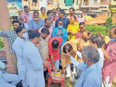 गांधी जयंती मनाने के बाद में पार्टी कार्यकर्ता के जन्मदिन पर बिना सोशल डिस्टेंस के केक काटते भाजपाई।