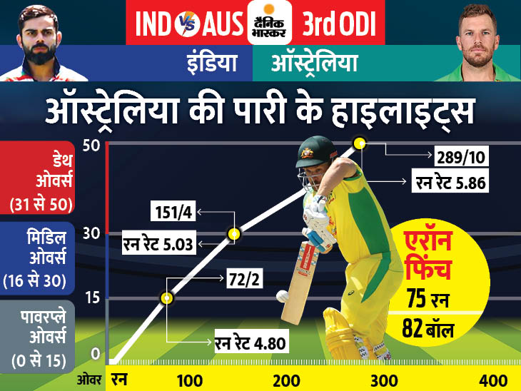 कोहली ने 63 रन बनाते हुए वनडे करियर की 60वीं फिफ्टी लगाई। पंड्या की छठवीं और जडेजा की 13वीं फिफ्टी रही। ऑस्ट्रेलिया के लिए एश्टन एगर ने सबसे ज्यादा 2 विकेट लिए। एडम जम्पा, सीन एबॉट और जोश हेजलवुड को 1-1 विकेट मिला।