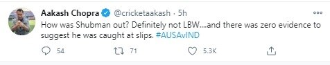 आकाश चोपड़ा ने शुभमन के आउट होने पर ट्वीट करते हुए कहा कि शुभमन कैसे आउट हुए? निश्चित रूप से एलबीडब्ल्यू नहीं थे और यह बताने के लिए भी कोई सबूत नहीं था कि स्लिप में उनका कैच पकड़ा गया है.