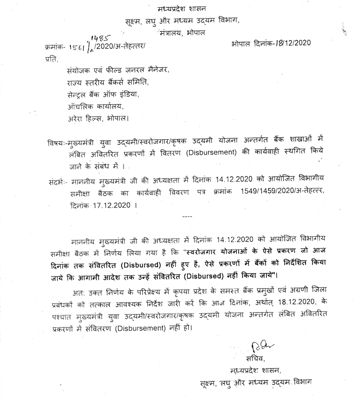 - MSME विभाग ने स्टेट लेबल बैंकर्स कमेटी को भेजे पत्र में दिया सीएम की अध्यक्षता में हुई बैठक का हवाला
