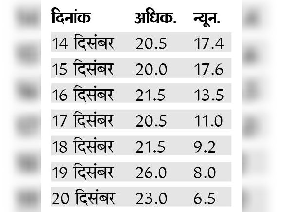 शासकीय जीवाजी वेधशाला से मिली जानकारी के अनुसार रविवार को अधिकतम तापमान 23 और न्यूनतम तापमान 6.5 डिग्री था। इसके पहले शनिवार को अधिकतम तापमान 26 और न्यूनतम तापमान 8 डिग्री दर्ज किया था। मौसम विभाग भोपाल के विशेषज्ञ एचएस पांडे्य के अनुसार आसमान खुला रहने से दिन में भी ठंडी हवा चलने के आसार बन रहे हैं। जब तक हवा का रुख उत्तरी रहेगा तब तक सर्दी महसूस होगी।