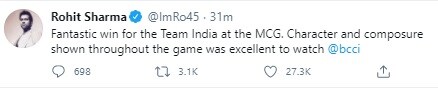 ऑस्ट्रेलिया में इस समय क्वारंटीन रोहित शर्मा ने जीत के बाद ट्वीट करके कहा कि मेलबर्न क्रिकेट ग्राउंड पर टीम इंडिया की शानदार जीत. मैच में संतुलन देखना अच्छा था.