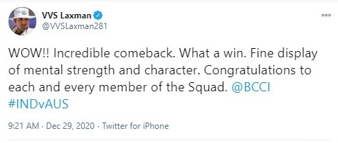 वहीं पूर्व भारतीय क्रिकेटर वीवीएस लक्ष्मण ने कहा कि शानदार वापसी, क्या जीत थी. मानसिक ताकत का अच्छा प्रदर्शन.टीम के हर एक सदस्य को बधाई