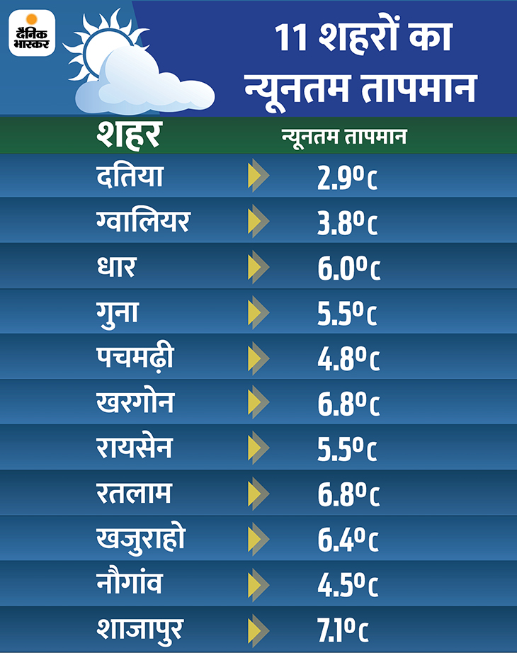 हिमाचल-जम्मू कश्मीर में पहाड़ों पर हो रही है बर्फबारी के चलते समूचा उत्तर भारत कड़ाके की ठंड झेल रहा है। असर मध्यप्रदेश में दिखने लगा है। वहां से आ रही बर्फीली हवाओं से प्रदेश में ठिठुरन बढ़ गई है। तीन शहर दतिया, ग्वालियर और धार शीतलहर की चपेट में आ गए हैं। वहीं, 11 शहरों में न्यूनतम पारा 7 डिग्री से नीचे पहुंच गया है। सबसे सर्द रात दतिया में रही, यहां का न्यूनतम तापमान लुढ़ककर 3 डिग्री रिकॉर्ड किया गया।