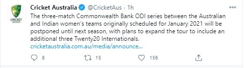 भारत ने अपना पिछला मुकाबला मार्च में टी20 वर्ल्ड कप का खिताबी मुकाबला खेला था, जहां टीम को ऑस्ट्रेलिया के हाथों हार का सामना करना पड़ा था. क्रिकेट ऑस्ट्रेलिया के अंतरिम सीईओ निक हॉक्ले ने कहा कि ऑस्ट्रेलिया की महिला टीम अगले सीजन भारत की मेजबानी करेगी. हम अगले सीजन के लिए भारत और ऑस्ट्रेलिया के बीच एक विस्तारित शेड्यूल देने की उम्मीद कर रहे हैं. उन्होंने कहा कि हमें उम्मीद थी कि हम भारत की इस सीजन मेजबानी कर पाएंगे. मगर दुनियाभर में फैले कोरोना वायरस के चलते हमें इस सीरीज को स्थगित करना जरूरी हो गया.