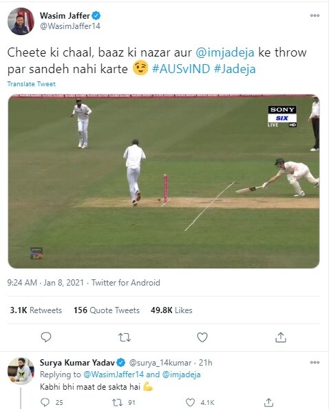 जाफर ने ट्वीट किया कि चीते की चाल, बाज की नजर और रवींद्र जडेजा के थ्रो पर संदेह नहीं करते. उनके इस ट्वीट पर मुंबई के स्टार खिलाड़ी सूर्यकुमार यादव ने कहा कि कभी भी मात दे सकता है