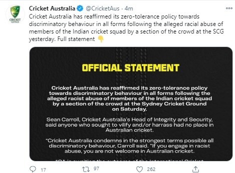 ऑस्ट्रेलियाई दर्शकों की इस हरकत पर क्रिकेट ऑस्ट्रेलिया ने टीम इंडिया से माफी मांगी और सोशल मीडिया पर बयान जारी करके कहा कि इस तरह के व्यवहार के लिए क्रिकेट ऑस्ट्रेलिया की जीरो टॉलरेंस नीति है. उन्होंने दर्शकों को कहा कि अगर आप नस्लीय टिप्पण करते हैं तो ऑस्ट्रेलियन क्रिकेट में आपका स्वागत नहीं किया जाएगा. क्रिकेट ऑस्ट्रेलिया ने कहा कि बोर्ड आईसीसी जांच का इंतजार कर रहा है. एक बार दोषी की पहचान हो जाए तो उसके खिलाफ एक्शन लिया जाएगा. उन्होंने कहा कि बतौर मेजबान भारतीय क्रिकेट में हम हमारे दोस्तों से माफी मांगते हैं.
