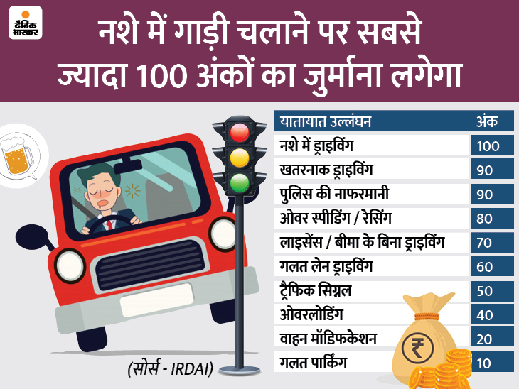 ट्रैफिक नियमों का उल्लंघन करने पर जुर्माने के अंक तय किए गए हैं। नशे में गाड़ी चलाने पर सबसे अधिक 100 अंकों का जुर्माना लगेगा। नीचे टेबल में देखिए किस नियम के उल्लंघन पर जुर्माने का अंक क्या है।
