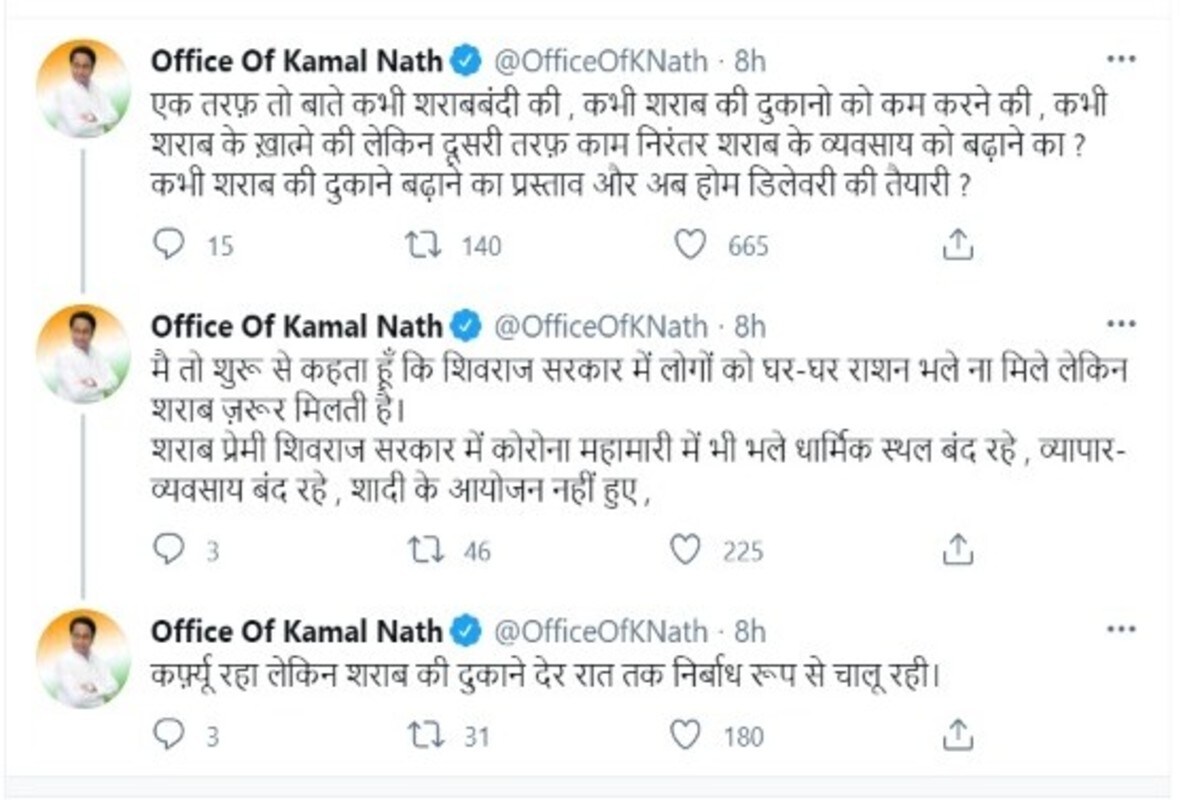 ऑफिस ऑफ कमलनाथ की ओर से किए किए गए इस ट्वीट के बाद शिवराज सरकार पर कांग्रेस नेता हमलावर हो गए हैं. कमलनाथ ने अपने ट्वीट में होम डिलेवरी की तैयारी पर शिवराज सिंह सरकार पर बड़ा आरोप लगाया है. उन्होंने दूसरे ट्वीट में कहा, ‘मैं तो शुरू से ही कहता हूं कि शिवराज सरकार में लोगों को घर-घर राशन भले न मिले, लेकिन शराब जरूर मिलती है. शराब प्रेमी शिवराज सरकार में कोरोना महामारी में भी भले धर्मिक स्थल बंद रहे, व्यापार-व्यवसाय बंद रहे, शादी के आयोजन नहीं हुए, कर्फ्यू रहा, लेकिन शराब की दुकानें निर्बाध रूप से चालू रहीं.’ पूर्व सीएम कमलनाथ की ओर से किए गए इस ट्वीट के बाद शिवराज सरकार पर आरोपों की झड़ी लगने लगी है. कांग्रेस इस मुद्दे पर हमला करने में कोई कसर नहीं छोड़ रही है.