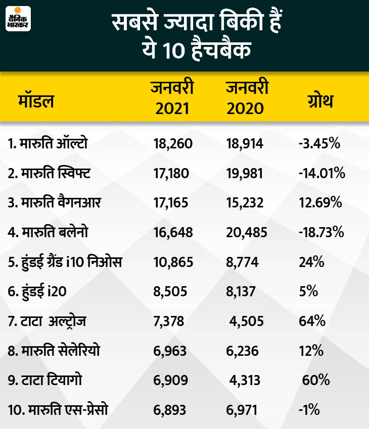 पिछले महीने सबसे ज्यादा बिकने वाली हैचबैक मारुति ऑल्टो रही। इसकी 18,260 यूनिट बिकी, हालांकि पिछले साल की तुलना में यह -3.45% की गिरावट है। 17,180 कारों के साथ स्विफ्ट दूसरी सबसे ज्यादा बिकने वाली हैचबैक रही। सेगमेंट में सबसे ज्यादा 64% की ग्रोथ अल्ट्रोज की बिक्री में रही। टाटा ने पिछले महीने 7,378 अल्ट्रोज बेची।