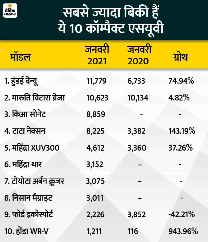 सेगमेंट में सबसे ज्यादा 943.96% की ग्रोथ होंडा WR-V की रही। होंडा ने पिछले महीने 1,211 WR-V बेची, जबकि पिछले साल इसी अवधि में सिर्फ 116 WR-V कारें ही बिकी थीं। 11,779 यूनिट के साथ हुंडई वेन्यू सबसे ज्यादा बिकने वाली कॉम्पैक्ट एसयूवी रही। यह सालाना आधार पर 74.94% की ग्रोथ है। नेक्सन की बिक्री में 143.19% की ग्रोथ रही।