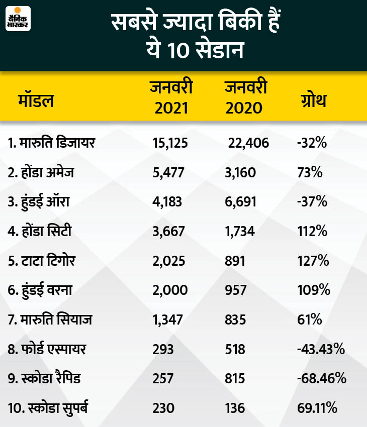 पिछले महीने मारुति ने 15,125 डिजायर बेची। सालाना आधार पर इसमें 32% गिरावट रही, बावजूद डिजायर लिस्ट में टॉप पोजीशन पर है। 5,477 यूनिट के साथ होंडा अमेज दूसरी सबसे ज्यादा बिकने वाली सेडान रही। सेगमेंट में सबसे ज्यादा 127% की ग्रोथ टाटा टिगोर की बिक्री में रही। पिछले महीने 2,025 टाटा टिगोर बिकी। सबसे ज्यादा 68.46% की गिरावट स्कोडा सुपर्ब की बिक्री में रही।