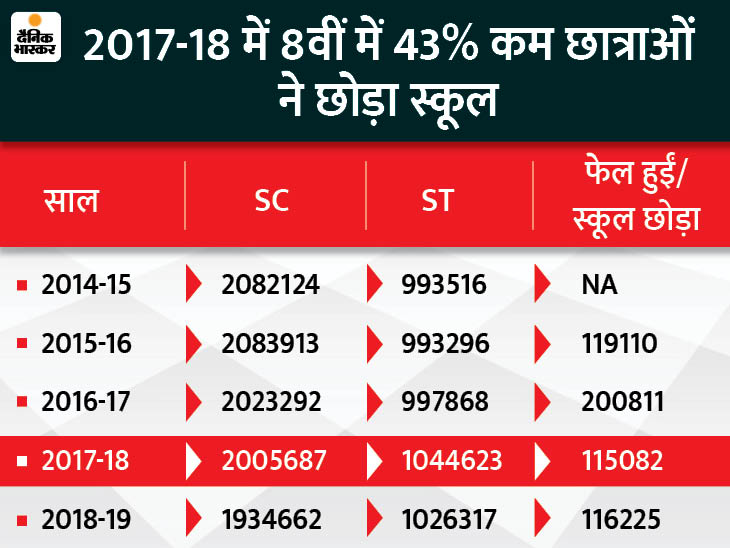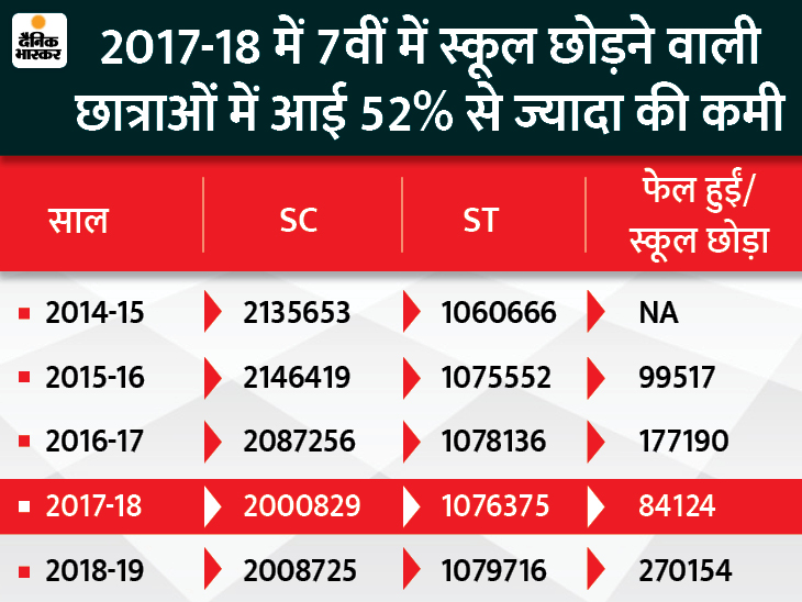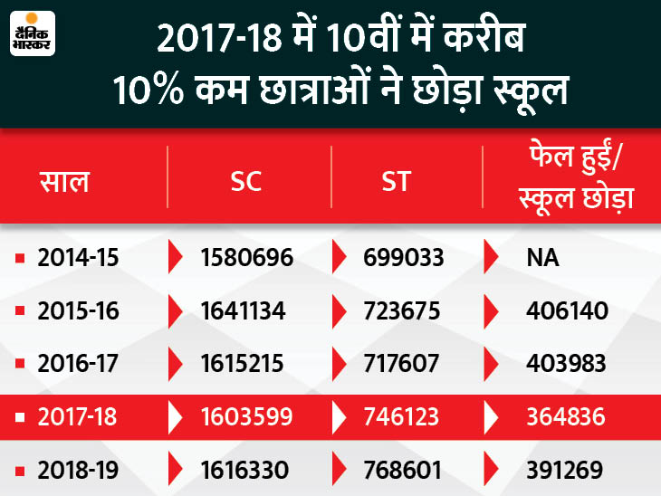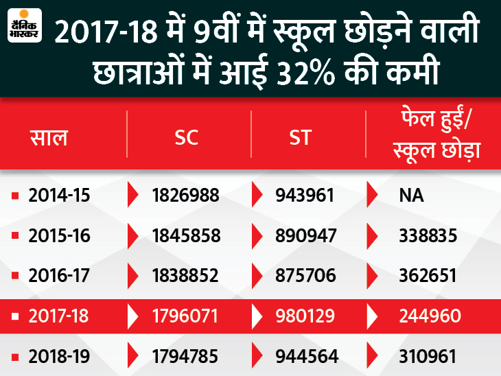 2016 के एक आंकड़े के अनुसार, देश में 11 से 17 साल तक की कुल SC-ST लड़कियों की आबादी 2 करोड़ 90 लाख थी। उनमें 6वीं से लेकर 10वीं तक कुल 1 करोड़ 43 लाख पढ़ रही थीं। यानी 50% से ज्यादा लड़कियां माध्यमिक शिक्षा के लिए स्कूलों में नहीं थीं। 2017-18 में जब सरकार ने योजना का बजट 711% बढ़ाया था, तब 9वीं ही नहीं इसका असर छठी कक्षा से लेकर 10वीं तक नजर आया था।