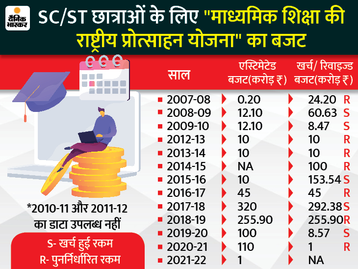 सरकार ने 2019-20 में योजना का बजट 100 करोड़ रुपए रखा, लेकिन खर्च 8.57 करोड़ रुपए कर पाई। अगले साल यानी 2020-21 में 110 करोड़ का बजट घोषित तो किया, लेकिन खर्च एक करोड़ ही हुए। इस योजना के लिए 2021-22 का अनुमानित बजट एक करोड़ है। इस साल कितनी SC-ST छात्राएं 9वीं में जाएंगी, इसका पुख्ता आंकड़ा मौजूद नहीं है, लेकिन 2019 तक हर साल करीब 27 लाख SC-ST छात्राएं 9वीं में प्रवेश ले रही थीं। अगर योजना के तहत हर छात्रा को तीन हजार की स्कॉलरशिप दी जाए तो भी 800 करोड़ रुपए से ज्यादा का बजट चाहिए होगा।