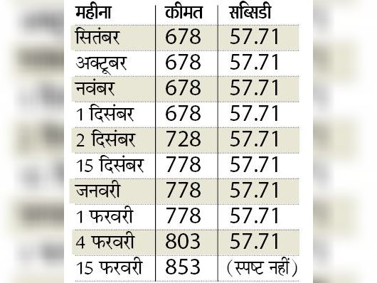 दूसरी तरफ बात यदि सब्सिडी को लेकर करें तो ग्राहकों के खाते में 14 फरवरी तक पहले की तरह 57.71 रुपए पहुंच रहे थे। एक सिलेंडर पर 50 रुपए की वृद्धि 15 फरवरी से लागू होगी। सोमवार को गैस एजेंसियों की छुट्टी रहती है। इस कारण पुरानी बुकिंग की पर्ची बदलने पर सिलेंडरों की सप्लाई मंगलवार से नए रेट पर की जाएगी।