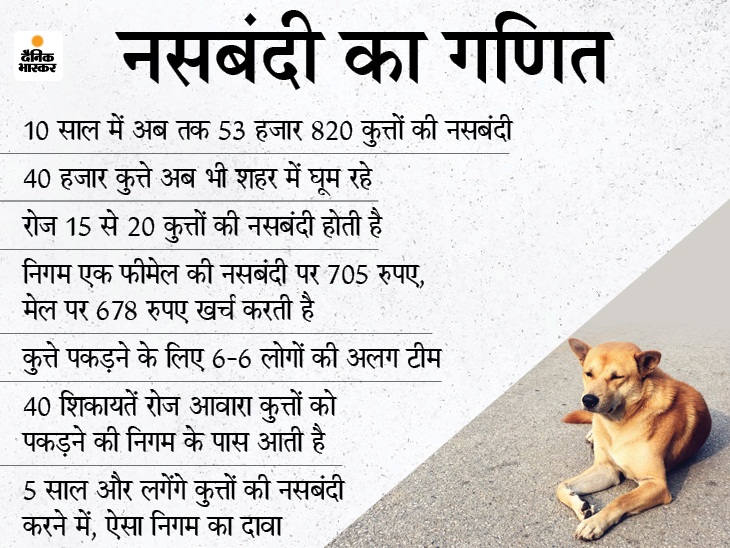 नगर नगम के सहायक स्वास्थ्य अधिकारी आरके गुप्ता के मुताबिक अब तक शहर में 53 हजार 820 के लगभग कुत्तों की नसबंदी हो चुकी हैं। इसमें मई 2020 तक 27 हजार 889 कुतियों का तो 23 हजार 931 कुत्तों का ऑपरेशन हो चुका है। मई से दिसंबर तक दो हजार के लगभग और ऑपरेशन हुआ है। वेटरनरी की तरफ से 2020 में कराए गए सर्वे में 35 हजार कुत्ते-कुतियां की संख्या ऐसी मिली थी, जिसका नसबंदी होना है। ये टारगेट पूरा करने के लिए नसबंदी केंद्र बढ़ाने की तैयारी में है।