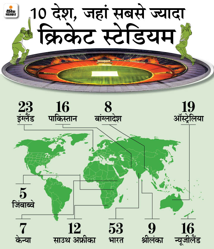 क्रिकेट की शुरुआत इंग्लैंड से हुई, लेकिन वहां 23 क्रिकेट स्टेडियम ही हैं। जबकि भारत में 53 क्रिकेट स्टेडियम हैं। ये दुनिया में सबसे ज्यादा है। हालांकि, इनमें से सिर्फ 24 स्टेडियम में ही इंटरनेशनल या डोमेस्टिक क्रिकेट खेला जा रहा है।