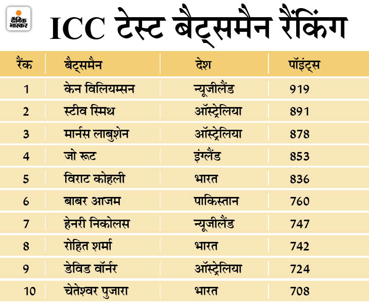 न्यूजीलैंड के कप्तान केन विलियम्सन 919 पॉइंट के साथ टॉप पर काबिज हैं, जबकि ऑस्ट्रेलियाई बैट्समैन स्टीव स्मिथ (891) दूसरे नंबर पर बने हुए हैं। ऑस्ट्रेलिया के मार्नस लाबुशेन तीसरे नंबर पर हैं। इंग्लैंड के कप्तान जो रूट चौथे और भारतीय कप्तान विराट कोहली 5वें नंबर पर बरकरार हैं।