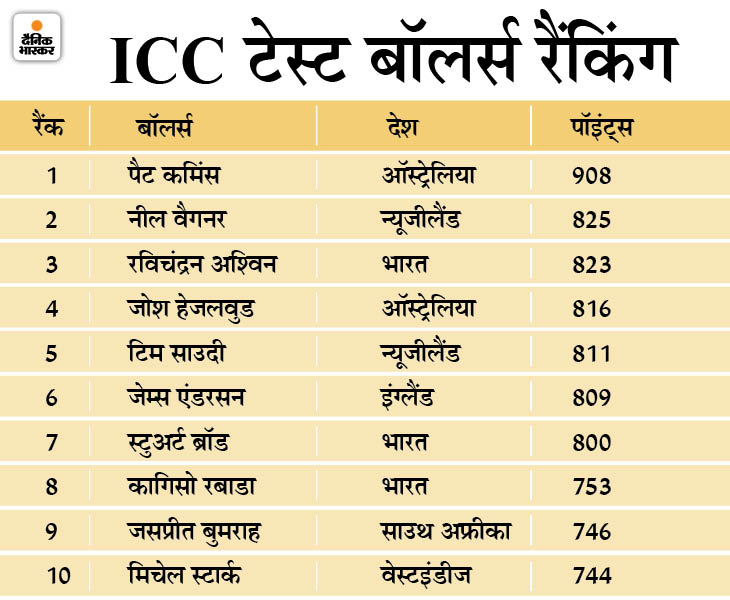 एंडरसन को 3 स्थान का नुकसान हुआ और वे छठे पायदान पर पहुंच गए। वहीं, ब्रॉड 7वें नबंर पर पहुंच गए। गेंदबाजों की रैंकिंग में टॉप पर ऑस्ट्रेलिया के पैट कमिंस और दूसरे नंबर पर न्यूजीलैंड के नील वैगनर हैं। अश्विन के बाद चौथे नंबर पर जोश हेजलवुड हैं।
