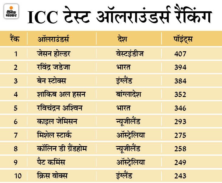 टेस्ट में ऑलराउंडर्स की रैंकिंग में भारत के 2 खिलाड़ी हैं। अश्विन 5वें और रविंद्र जडेजा नंबर-2 पर काबिज हैं। वेस्टइंडीज के जेसन होल्डर 407 पॉइंट्स के साथ टॉप पर हैं। वहीं, इंग्लैंड के स्टोक्स तीसरे नंबर पर पहुंच गए।