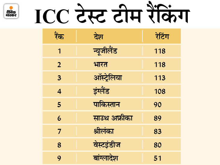 टीमों की रैंकिंग में न्यूजीलैंड और भारत दोनों के 118-118 पॉइंट्स हैं। हालांकि, न्यूजीलैंड दशमलव कुछ अंकों से भारत से आगे है। इसलिए टॉप पर है। ऑस्ट्रेलिया 113 पॉइंट्स के साथ तीसरे स्थान पर हैं।