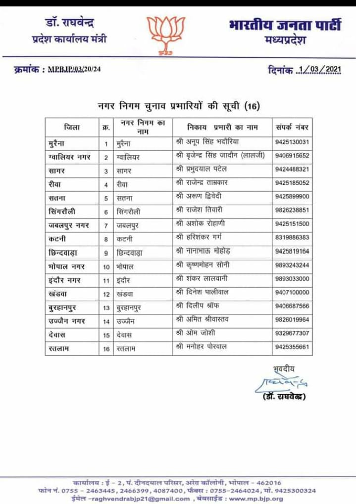 भाजपा ने नगर निगम और नगर निकाय चुनावाें के लिए साेमवार काे जिला चुनाव प्रभारियों की घोषणा कर दी है। भाजपा प्रदेश अध्यक्ष वीडी शर्मा की सहमति के बाद प्रदेश कार्यालय मंत्री डाॅ. राघवेंद्र ने 16 नगर निगम और 54 नगर निकाय के लिए प्रभारी घोषित कर दिए हैं। इसमें इंदौर की जिम्मेदारी सांसद शंकर लालवानी को सौंपी गई है, जबकि इंदौर ग्रामीण के लिए राधेश्याम यादव को प्रभारी बनाया गया है। बता दें, इंदौर नगर निगम में महापौर समेत 85 वार्डाें के लिए चुनाव होना है। पिछले 20 साल से भाजपा इंदौर महापौर के पद पर काबिज रही है। उनकी कोशिश है कि इस बार भी वे बाजी मारे। हालांकि कांग्रेस ने इस बार विधायक संजय शुक्ला को महापौर पद के लिए चयनित कर दिया है।