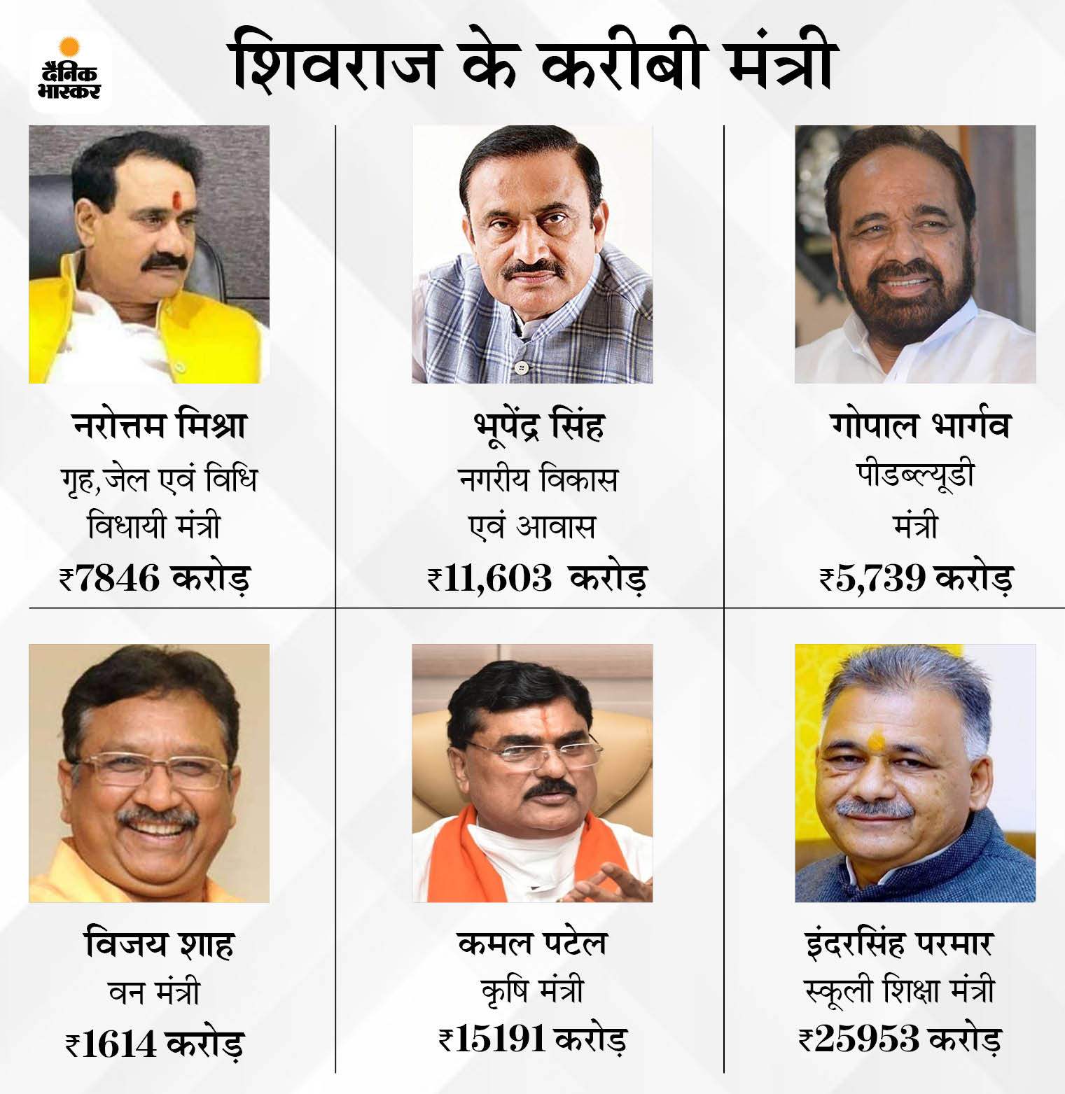 सरकार में बाकी मंत्री शिवराज गुट के हैं। इनमें मुख्य रूप से गृह मंत्री नरोत्तम मिश्रा, इंदरसिंह परमार, भूपेंद्र सिंह, गोपाल भार्गव, विजय शाह, यशोधरा राजे सिंधिया हैं। इनके खाते में कुल 67,646 करोड़ रुपए दिए गए हैं। इनमें सबसे ज्यादा स्कूली शिक्षा मंत्री इंदरसिंह परमार को 25,953 करोड़ रुपए मिले हैं। वहीं, सबसे कम वनमंत्री विजय शाह को 1,614 करोड़ रुपए मिले हैं।