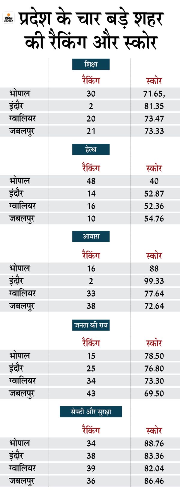 इंडेक्स के अनुसार प्रदेश के चार शहरों भोपाल, जबलपुर, इंदौर और ग्वालियर की तुलना में राजधानी एजुकेशन और हेल्थ में सबसे पीछे है। वहीं, सुरक्षा की दृष्टि से सुरक्षित शहर है। वहीं, लोगों की राय में भी भोपाल सबसे बेहतरीन शहर है। इसके अलावा म्युनिसिपल परफॉर्मेंस इंडेक्स के आधार पर भोपाल देश में नंबर-3 पर आया है। इस इंडेक्स को 114 शहरी निकायों के 20 सेक्टर और 100 इंडिकेटर के आधार पर तैयार किया गया है।