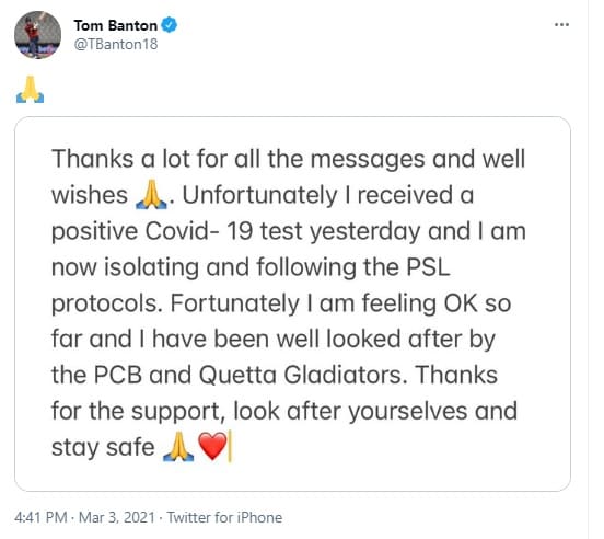 इससे पहले सोमवार को ऑस्ट्रेलियाई लेग स्पिनर फवद अहमद भी कोरोना पॉजिटिव पाए गए थे. बर्ने ने दोनों खिलाड़ियों और सहयोगी स्टॉफ के सदस्य के नाम का खुलासा नहीं किया था, लेकिन टॉम बैंटन ने ट्वीट कर इसकी पुष्टि कर दी. बैंटन ने ट्वीट किया, ”दुर्भाग्य से मैं कोविड-19 जांच में पॉजिटिव आया और अब मैं पृथकवास में हूं और पीएसएल प्रोटोकॉल का पालन कर रहा हूं. अच्छी बात है कि अभी तक मुझे कोई लक्षण नहीं हैं, मैं अच्छा महसूस कर रहा हूं.”