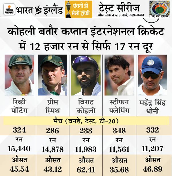 कोहली की सेंचुरी का इंतजार फैंस पिछले 15 महीने से कर रहे हैं। कोहली ने पिछला शतक नवंबर, 2019 में बांग्लादेश के खिलाफ लगाया था। अगर कोहली इस मैच में शतक लगाते हैं, तो वे पोंटिंग समेत दुनिया के सभी कप्तानों को पीछे छोड़ देंगे। वे बतौर कप्तान सबसे ज्यादा 42 शतक लगाने वाले बैट्समैन बन जाएंगे।