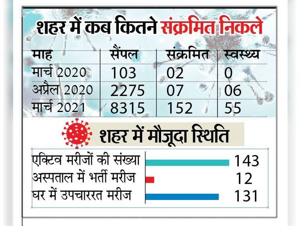 यही कारण है कि 1 मार्च को शहर में एक्टिव केसों की संख्या 49 थी, जो 12 मार्च को बढ़कर 143 पहुंच गई है। यानी इसमें ढाई गुना वृद्धि हुई। यह आंकड़ा इसलिए भी खतरनाक है, क्योंकि कोरोना संक्रमण के शुरुआती समय मार्च 2020 के अंत व अप्रैल में लगभग 2400 सैंपल की जांच की गई थी।
