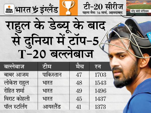 राहुल ने अब तक 48 टी-20 इंटरनेशनल मैच खेले हैं। इनमें उन्होंने 40.60 के स्ट्राइक रेट से 1543 रन बनाए हैं। इनमें उन्होंने 14 बार फिफ्टी प्लस का स्कोर बनाया है। खास बात यह है कि राहुल ने जबसे टी-20 इंटरनेशनल में डेब्यू किया है तब से वे इस फॉर्मेट में भारत की ओर से सबसे ज्यादा रन बनाने वाले बल्लेबाज हैं। रोहित शर्मा और विराट कोहली भी उनसे पीछे हैं। अगली तस्वीर में देखिए राहुल के डेब्यू के बाद से टी-20 इंटरनेशनल में दुनिया में सबसे ज्यादा रन बनाने वाले टॉप-5 बल्लेबाज कौन हैं।