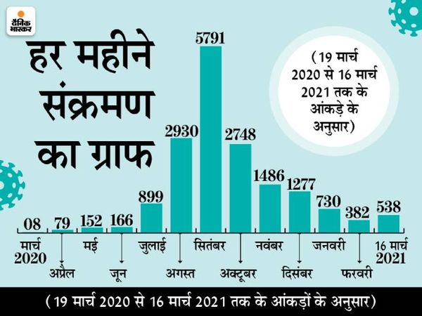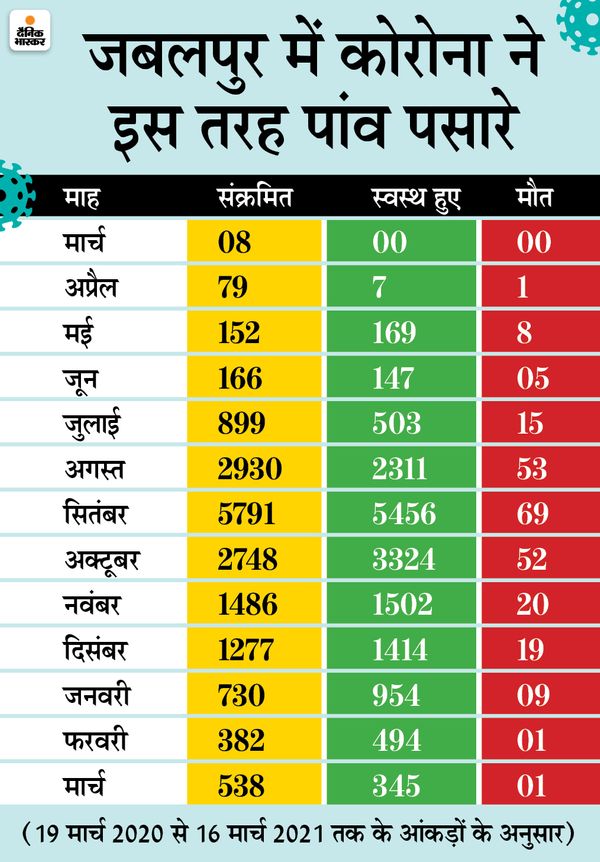 जानकारी के अनुसार कोरोना का प्रदेश में सबसे पहला मामला 19 मार्च को जबलपुर में ही आया था। तब चार लोग संक्रमित हुए थे। इसमें तीन एक ही अग्रवाल परिवार के और एक युवक पचपेढ़ी का रहने वाला संक्रमित हुआ था। कोरोना का सबसे भयावह रूप अगस्त से दिखा। सितंबर 2020 सबसे हाई रहा। अब एक बार फिर संक्रमण की दर बढ़ी है।