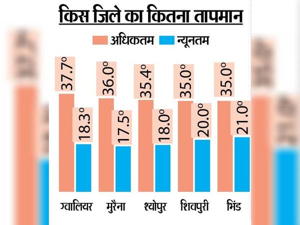 मौसम विभाग के अनुसार शुक्रवार को भी बादल छाने और गरज-चमक के साथ बूंदाबांदी के आसार बने हुए हैं। 20 मार्च से नया पश्चिमी विक्षोभ सक्रिय होगा। इसका अंचल में असर 22 मार्च की शाम से होगा। वहीं राजस्थान की ओर से आने वाली गर्म हवा के चलते गुुरुवार को दोपहर 2:30 बजे तक पारा 37 डिग्री के पार पहुंच चुका था। अधिकतम तापमान 37.7 डिग्री सेल्सियस तो न्यूनतम तापमान भी 1.1 डिग्री सेल्सियस बढ़त के साथ 18.3 डिग्री दर्ज हुआ।