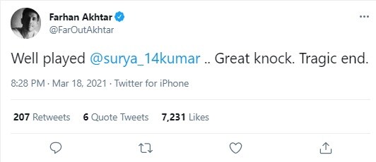 फरहान अख्तर ने ट्वीट करते हुए लिखा- शानदार खेला सूर्यकुमार यादव, बेहतरीन पारी.. दुखद अंत.
