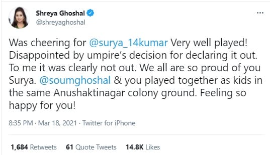 बॉलीवुड सिंगर श्रेया घोषाल ने लिखा- सूर्यकुमार यादव के लिए चियर कर रही थी. बहुत शानदार खेला. आपको आउट देने के अंपायर के फैसले से निराशा. मेरे लिए यह साफ-साफ नॉटआउट था. हम सबको आप पर गर्व है सूर्या. सौम्यदीप घोषाल और आप अनुशक्तिनगरकॉलोनी के मैदान में बच्चों के रूप में एक साथ खेले. तुम्हारे लिए बहुत खुश हूं.
