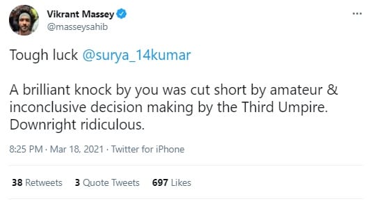 विक्रांत मेसी ने ट्वीट किया- दुर्भाग्य सूर्यकुमार यादव. थर्ड अंपायर द्वारा किए गए अपरिपक्कव निर्णय की वजह से आपकी शानदार पारी को छोटा कर दिया गया. हास्यास्पद.