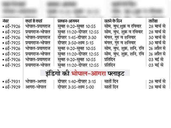 भोपाल से प्रयागराज के लिए इंडिगो की 28 मार्च से शुरू होने वाली फ्लाइट का शेड्यूल मई के पहले सप्ताह तक तीन बार बदलेगा। वहीं, आगरा फ्लाइट के शेड्यूल में कोई परिवर्तन नहीं होगा।