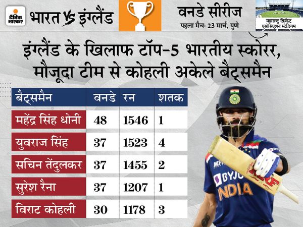 इंग्लैंड के खिलाफ अब तक 7 भारतीय बल्लेबाजों ने हजार से ज्यादा रन बनाए हैं। इनमें मौजूदा टीम से कप्तान विराट कोहली अकेले प्लेयर हैं। उन्होंने इंग्लिश टीम के खिलाफ 30 वनडे में 45.30 की औसत से 1178 रन बनाए हैं। कोहली इंग्लैंड के खिलाफ 3 शतक लगाने वाले युवराज सिंह (4) के बाद दूसरे भारतीय हैं। रन के मामले में महेंद्र सिंह धोनी (1546 रन) टॉप पर हैं।