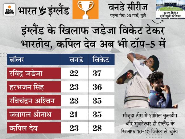 मौजूदा टीम में शामिल स्पिनर कुलदीप यादव और तेज गेंदबाज भुवनेश्वर कुमार ही इंग्लैंड के खिलाफ 10-10 विकेट ले सके हैं। इनके अलावा कोई बॉलर यह आंकड़ा नहीं छू सका। वैसे इंग्लैंड के खिलाफ सबसे ज्यादा विकेट लेने वाले टॉप-3 बॉलर्स में सभी स्पिनर हैं। रविंद्र जडेजा 37 विकेट के साथ टॉप पर काबिज हैं। मौजूदा टीम में कुलदीप अकेले प्लेयर हैं, जिन्होंने इंग्लैंड के खिलाफ एक बार 4+ विकेट लिए हैं।