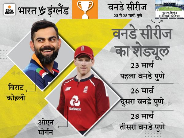 टी-20 सीरीज जीतने के बाद टीम इंडिया अब इंग्लैंड के खिलाफ वनडे सीरीज के लिए तैयार है। सीरीज के तीनों मैच 23, 26 और 28 मार्च को पुणे के महाराष्ट्र क्रिकेट एसोसिएशन के स्टेडियम में खेले जाएंगे। टीम इंडिया अपने घर में इंग्लैंड से 29 साल से द्विपक्षीय वनडे सीरीज में हारी नहीं है। पिछली बार इंग्लैंड ने दिसंबर 1984 में 4-1 से सीरीज जीती थी।