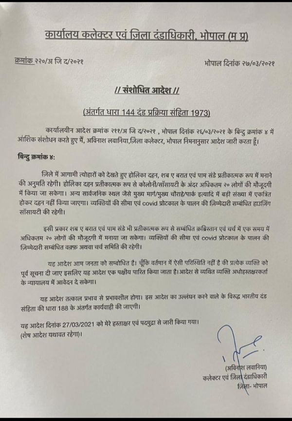 भोपाल में त्योहारों को लेकर कलेक्टर अविनाश लवानिया ने शनिवार देर रात संशोधित आदेश जारी किया। इसके तहत 20 लोगों के साथ होलिका दहन, शब ए बारात एवं पाप संडे प्रतीकात्मक रूप से मनाने की अनुमति दी गई है।