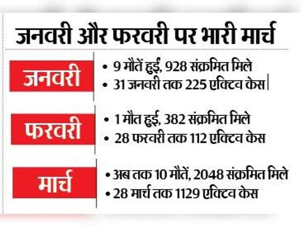 आँकड़ों पर गौर करें तो 1 मार्च से अब तक 28 दिनों में ही रिकवरी रेट 5 प्रतिशत घटकर 92.75 पर आ गया है, वहीं एक्टिव केस 10 गुना बढ़ गए हैं। जनवरी और फरवरी माह के मुकाबले, मार्च में सबसे ज्यादा संक्रमित मिले हैं, वहीं जान गँवाने वालों की संख्या भी इस वर्ष सबसे ज्यादा है। जनवरी से शुरू हुए कोराेना टीकाकरण अभियान को देखा जाए, तो सबसे ज्यादा 1 लाख से ज्यादा टीके सिर्फ मार्च में ही लगे हैं, जो कि जनवरी और फरवरी में लगे कुल टीकों के दोगुने से ज्यादा है।