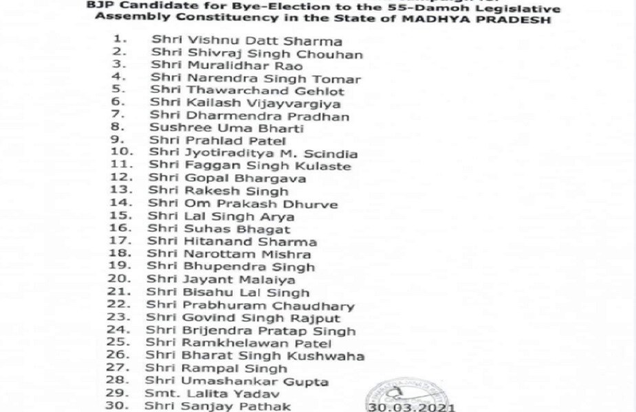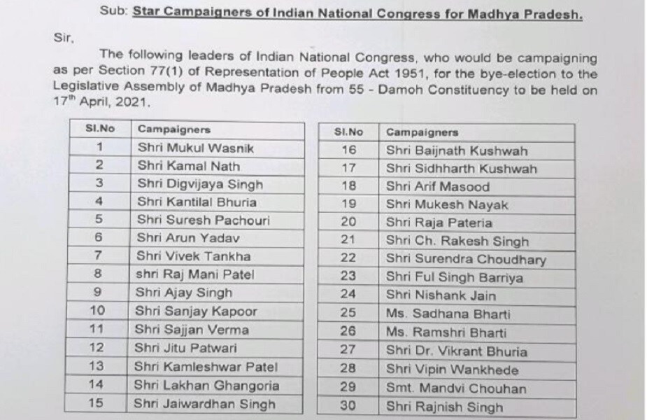 कांग्रेस ने जो लिस्ट जारी की है उन स्टार प्रचारकों में प्रदेश प्रभारी मुकुल वासनिक, पूर्व सीएम कमलनाथ, दिग्विजय सिंह, पूर्व पीसीसी चीफ कांतिलाल भूरिया, सुरेश पचौरी, अरुण यादव, राज्यसभा सांसद विवेक तन्खा, राजमणि पटेल, अजय सिंह, संजय कपूर और सज्जन सिंह वर्मा को शामिल किया है. पार्टी ने 2020 के विधान सभा उपचुनाव में हारे उम्मीदवार फूल सिंह बरैया और रामसिया भारती को भी प्रचार का मौका दिया है. ये दोनों स्टार प्रचारकों की सूची में शुमार हैं. लिस्ट में कुल 30 नेताओं को जगह मिली है.