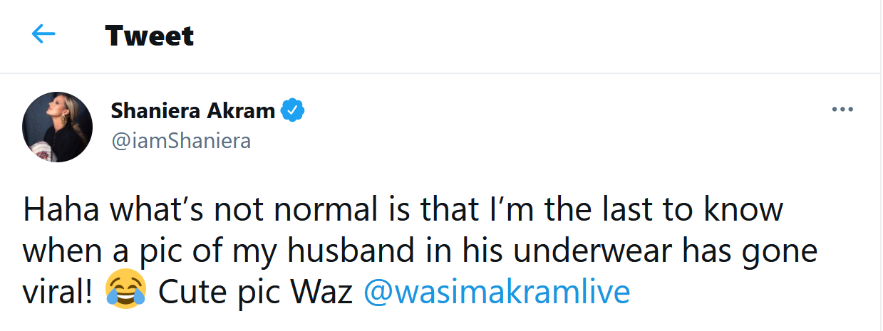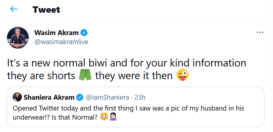 वसीम अकरम ने पत्नी शनीरा के ट्वीट का जवाब देते हुए लिखा, ‘यह एक आम बीवी है और आपकी जानकारी के लिए बता दूं कि यह शॉर्ट है, जोकि उस समय थी.’