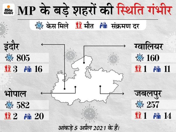 प्रदेश में सबसे ज्यादा मरीज इंदौर में ही मिल रहे हैं। हर रोज आंकड़े बढ़ते ही जा रहे हैं। यहां पर 805 मरीज मिले, जो अब तक का सबसे अधिक है। हर 6वां सैंपल पॉजिटिव आ रहा है। एक्टिव केस 5675 हैं। यहां भी मौतों की संख्या को लेकर सवाल खड़े होने लगे हैं। शहर के पांच मुक्तिधामों में 24 घंटे में 25 कोरोना मृतकों के अंतिम संस्कार किए गए, जबकि चार दिन में हेल्थ बुलेटिन में 12 मौत ही बताई गई हैं।