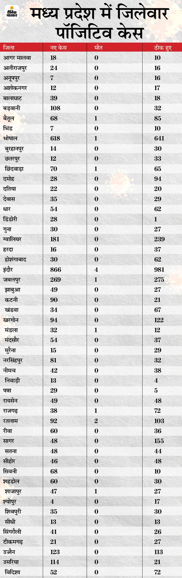 मध्यप्रदेश में कोरोना रोज नए रिकॉर्ड बना रहा है। बुधवार रात से शाजापुर में 58 घंटे का लॉकडाउन लगाया जाएगा। भोपाल में 618, इंदौर में 866, प्रदेश में 3722 पॉजिटिव मिलने के बाद से शनिवार और रविवार के दिन के लॉकडाउन लगाने की तैयारी की जा रही है। भोपाल, इंदौर और जबलपुर समेत 13 शहरों में भी वीकेंड लॉकडाउन लगाया जा सकता है। मुख्यमंत्री शिवराजसिंह चौहान ने इसका फैसला क्राइसिस मैनेजमेंट कमेटी पर छोड़ दिया है। जबलपुर में प्रशासन सही आंकड़े जारी नहीं कर रहा है तो ग्वालियर में साढ़े छह माह बाद एक दिन में 181 मरीज मिले हैं। भोपाल में मंगलवार को 618 तो प्रदेश में 3722 नए पॉजीटिव मिले। शाजापुर में 7 अप्रैल रात 8 बजे से 10 अप्रैल सुबह 6 बजे तक लॉकडाउन लगा दिया। यहां तीन दिन में 173 संक्रमित मिल चुके हैं। भोपाल में अब तक कोरोना से 640 लोगों की मौत हो चुकी है। अब तक 54637 लोग संक्रमित हो चुके हैं। इनमें से 49438 ठीक हो चुके हैं। अभी भोपाल में करीब 4800 एक्टिव केस हैं।